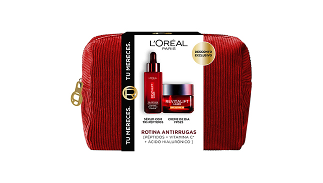 O Coffret Revitalift Laser da L’Oréal Paris inclui o Sérum Revitalift Laser com Tri-Péptidos, Creme de Dia Revitalift Laser FPS50 e uma bolsa prática para manter tudo organizado.