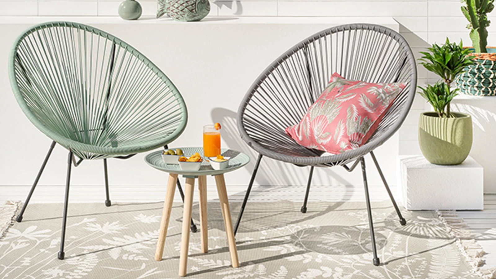 As cadeiras ovais já são um ícone de design, e a companhia ideal para desfrutar de momentos de tranquilidade no jardim, na varanda ou no terraço. Conferem um toque de sofisticação e é perfeita para usufruir de tempo de lazer a sós ou em momentos de convívio. Na KASA, estas cadeiras estão disponíveis em branco, preto e verde.