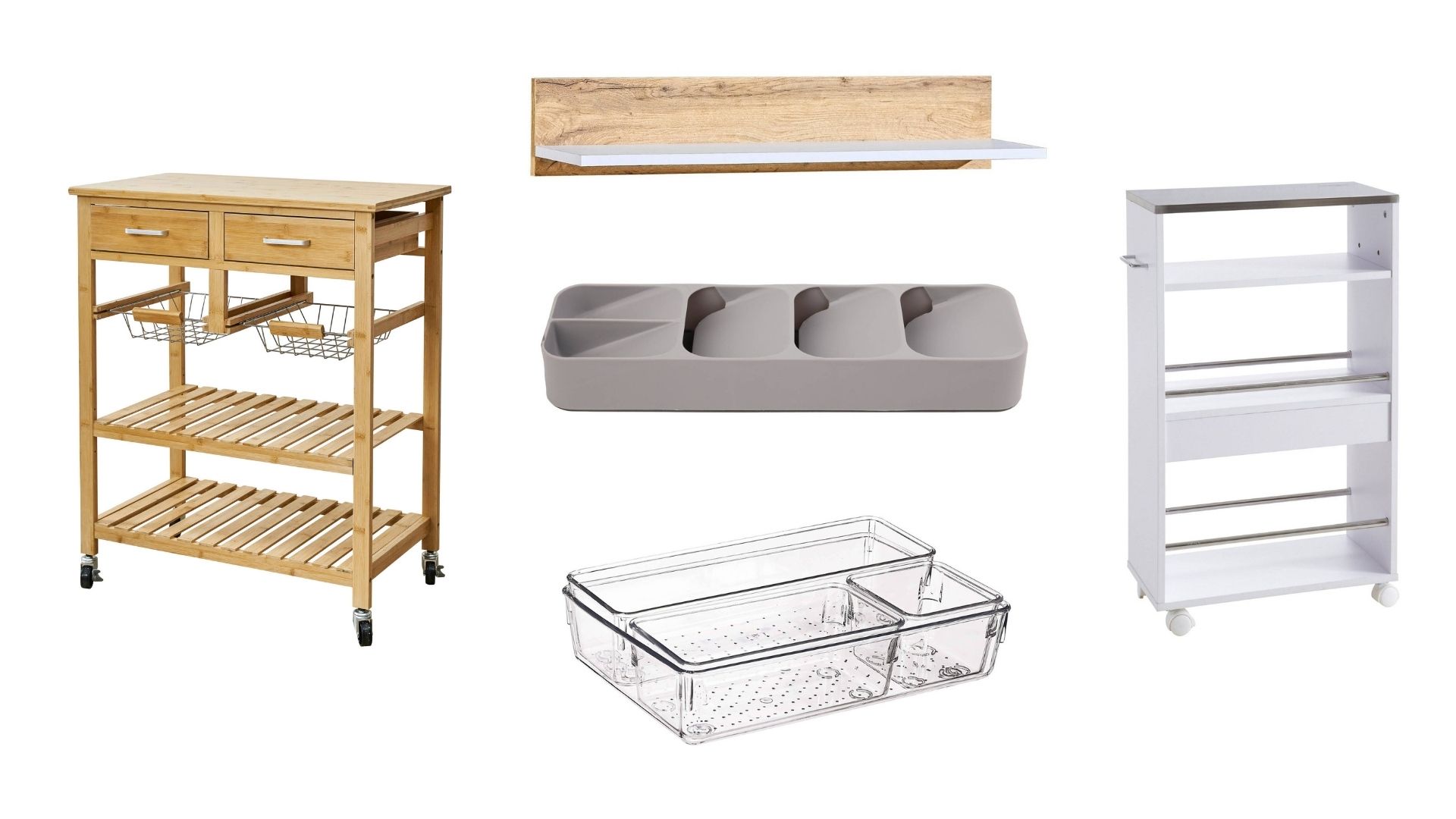 Móveis com rodas ou com arrumação integrada são ótimos em cozinhas pequenas: funcionam como extensão da bancada, carrinho de servir ou mini despensa. Quando não precisa, encosta à parede ou muda de lugar.