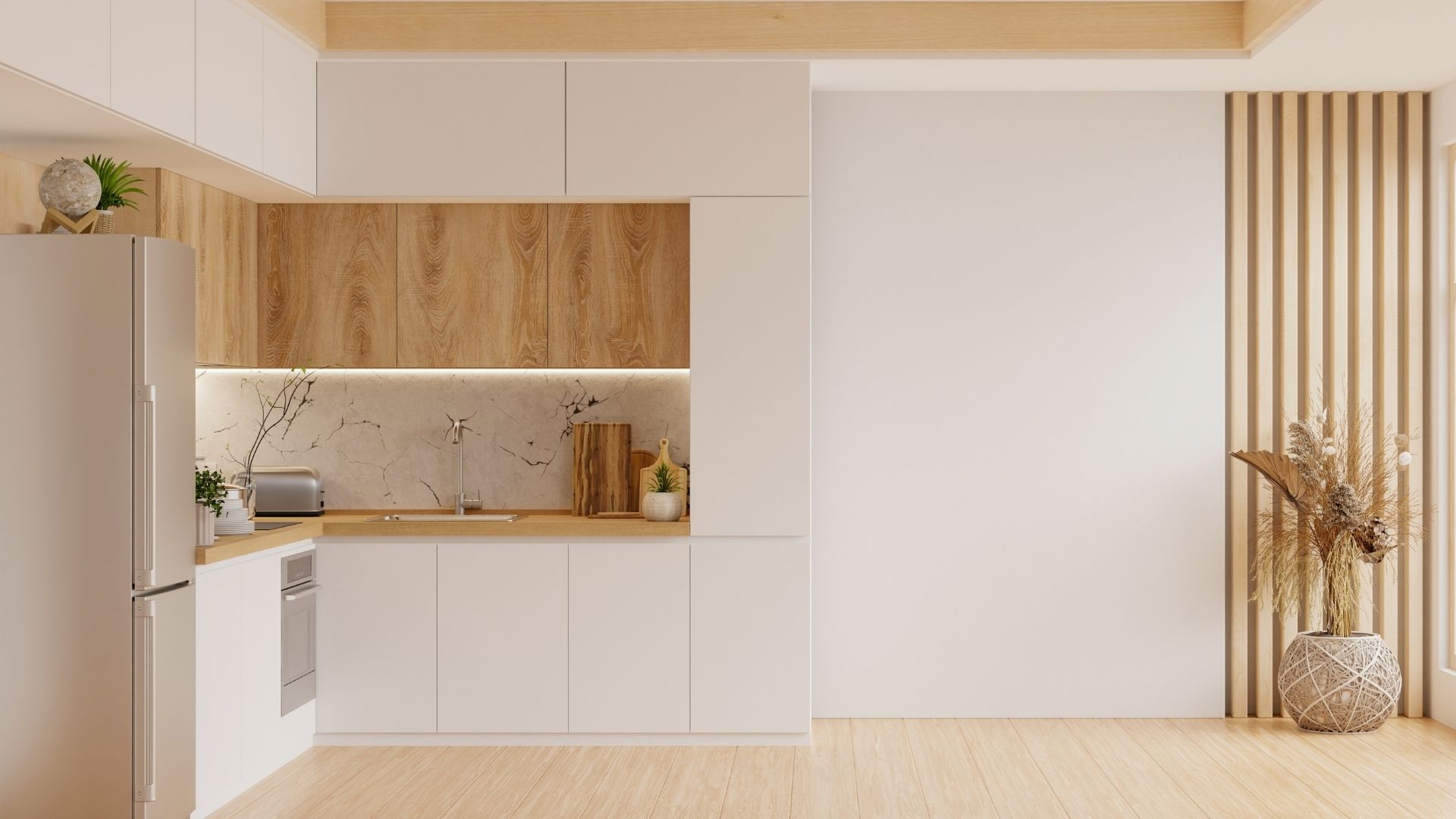 Com uma base clara, materiais naturais e pequenos toques de cor bem colocados, a cozinha ganha luz, aparenta ter mais metros e continua prática para o dia a dia.