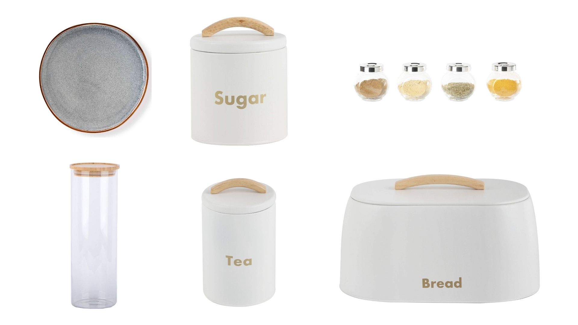 - Soluções diferentes de arrumação: caixa de pão Nature; lata com tampa sugar; lata com tampa tea; lata com tampa açúcar Bless.
