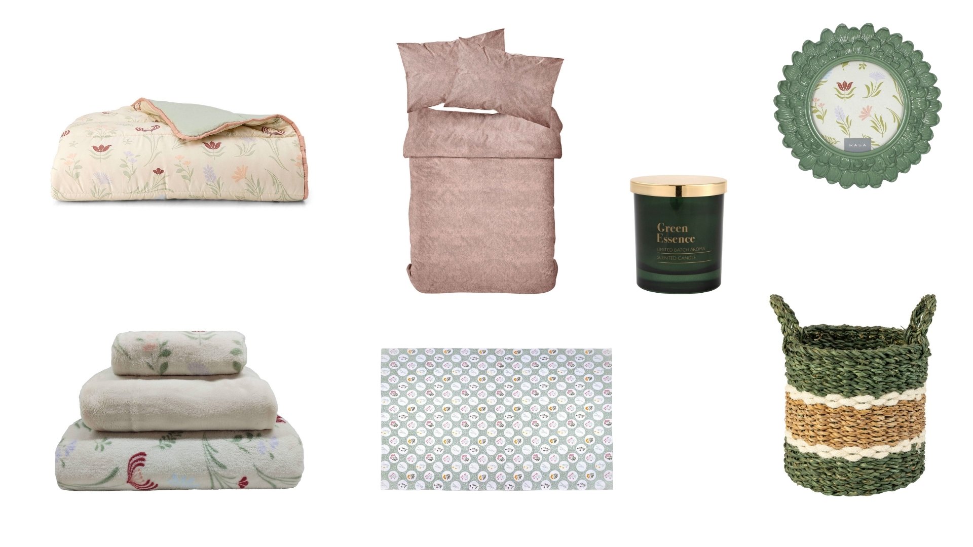 Sugestão KASA: o cesto de riscas largas redondo verde e a colcha de inverno Plantópia são detalhes que completam este visual orgânico e sereno.