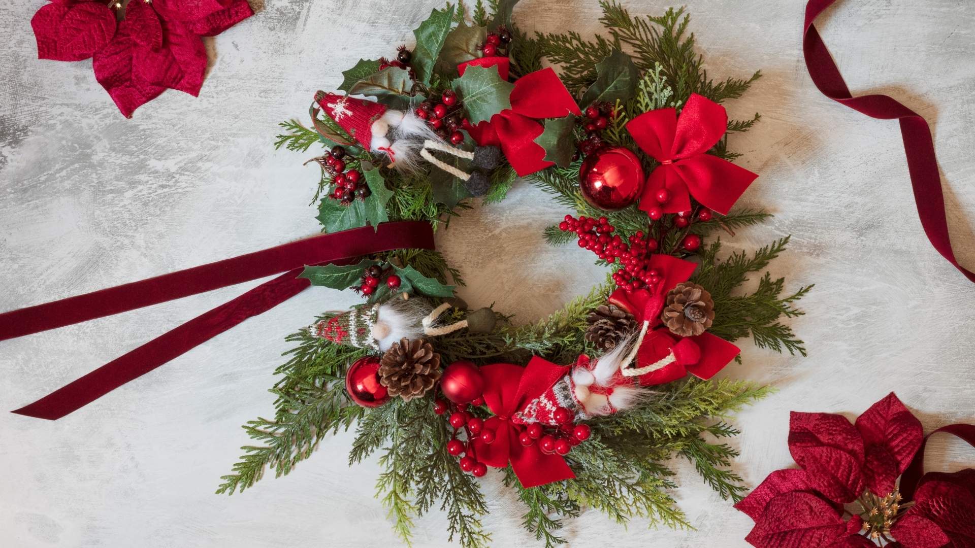 Escolha uma coroa para a porta da entrada com folhagem natural (eucalipto, pinheiro, alecrim) e adicione bagas secas, paus de canela, laranjas secas, pequenos sinos ou estrelas de papel reciclado. Finalize com um laço de tecido cru ou linho. Veja mais dicas neste artigo dedicado às coroas.