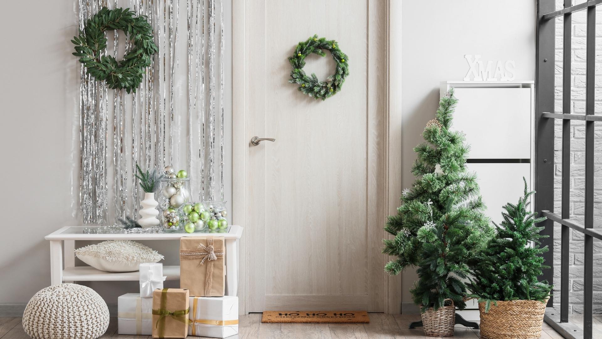 - Emoldure a porta com luzes LED de tom quente ou com uma grinalda de ramos naturais (eucalipto, cedro, alecrim), decorada com laços de juta, frutos secos ou pequenas pinhas;