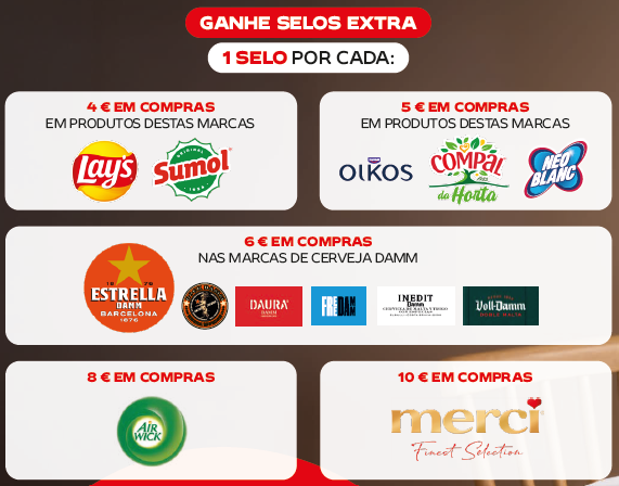 4.1.4 Durante toda a vigência da Campanha, por cada 6€ (seis euros) em compras associadas ao Cartão Continente, efetivamente pagas, numa das Lojas supra indicadas, em artigos das marcas de cerveja “Damm”, (incluindo “Estrella”, “Daura”, “Voll”, “Inedit”, “Bock” e “Free”), selecionados exclusivamente para a Campanha, e que se encontram discriminados no Anexo II do presente Regulamento. O referido valor, para atribuição do selo extra, poderá ser atingido com a compra de diferentes artigos da marca em questão numa única compra/encomenda.