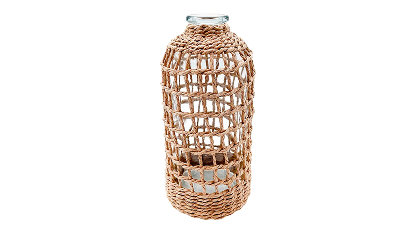 Por exemplo, esta jarra de vidro com detalhes em ráfia adiciona um charme rústico e acolhedor. Complete a decoração com plantas naturais, artificiais ou simplesmente com uma peça decorativa.