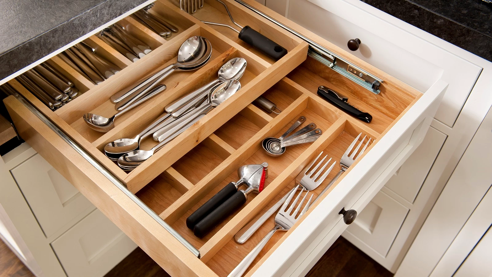 Disponha nas gavetas os talheres de mesa como garfos, facas, colheres de sopa, colheres de sobremesa e colheres de café. Para uma maior organização, coloque nas gavetas da cozinha compartimentos próprios para os talheres para que não se misturem e seja mais fácil encontrar o que precisa.