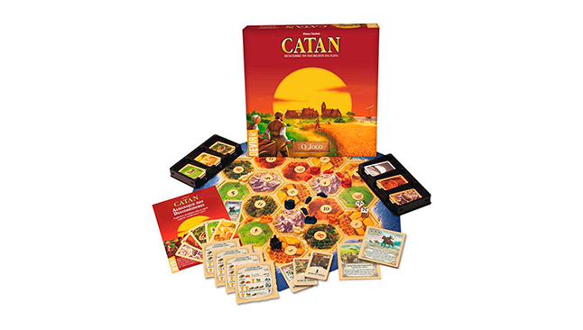 Catan é um clássico dos jogos de tabuleiro em que cada jogador assume o papel de um colonizador que constrói aldeias, estradas e cidades, utilizando madeira, tijolo, lã, minério e trigo. A estratégia está em trocar recursos com outros jogadores, negociar e expandir o seu território para ganhar pontos. No entanto, a sorte dos dados e a colocação de ladrões podem mudar o rumo do jogo a qualquer momento. Vence o primeiro jogador a acumular 10 pontos de vitória, obtidos através de expansões, construções e desenvolvimento. Catan é um jogo de estratégia, negociação e planeamento que garante diversão e reviravoltas emocionantes a cada partida!