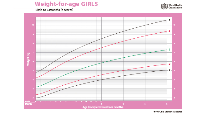 Estas tabelas ajudam a monitorizar o desenvolvimento saudável do bebé, permitindo aos profissionais de saúde avaliar o crescimento. Por exemplo, para meninas, o gráfico é o seguinte, em que no eixo horizontal se representa a idade em semanas e meses, e no eixo vertical se apresenta o peso.