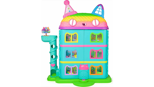 A Casa de Celebração da Gabby's Dollhouse tem forma de gato, quatro andares repletos de surpresas, um elevador e muitos acessórios escondidos. Além disso, toca música e tem uma banheira que faz bolhas. É o cenário perfeito para os miúdos se entreterem durante as horas de diversão e soltarem a criatividade.