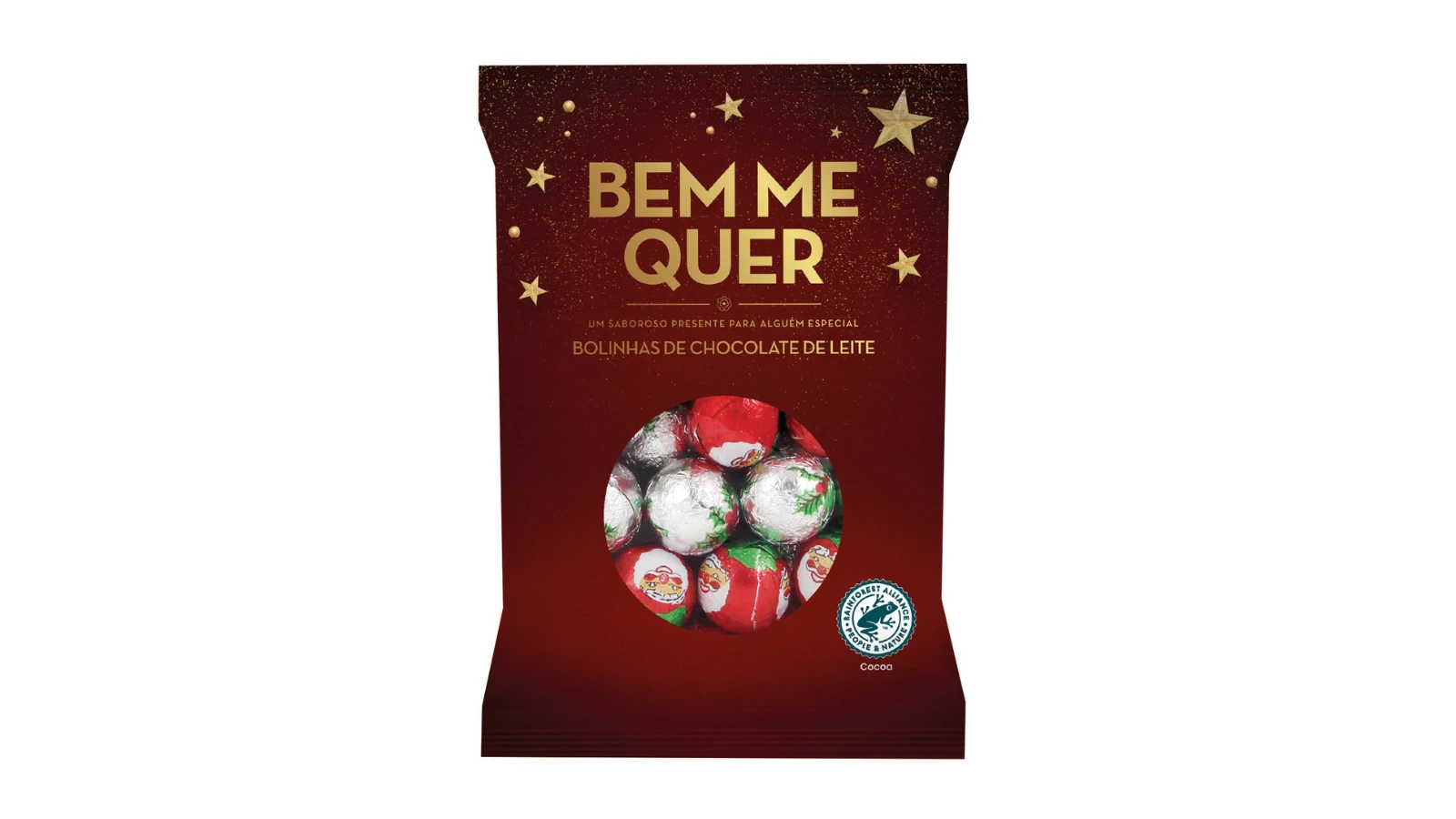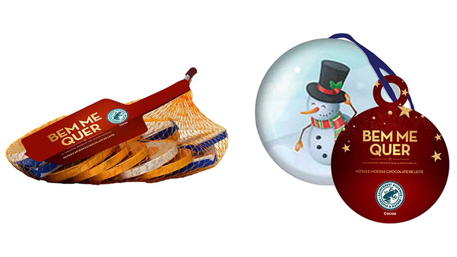 Para os mais pequenos que adoram chocolate, a marca Bem Me Quer apresenta notas e moedas de chocolate de leite na versão em rede ou bola decorativa.