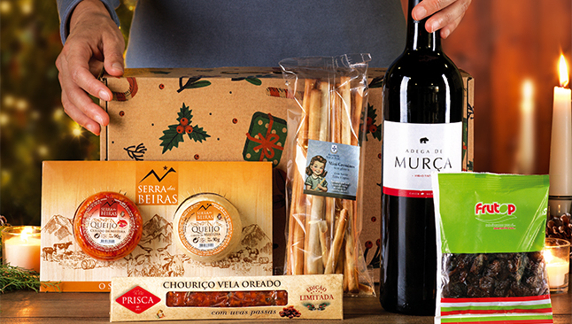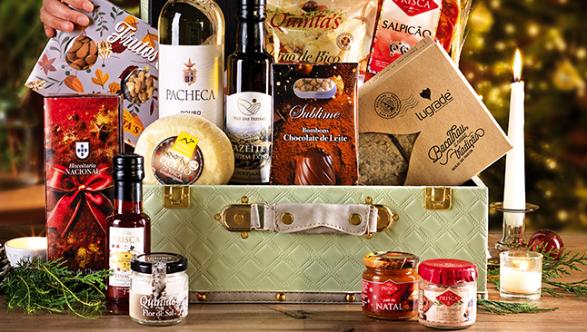 - Cabaz nº 24 (250€): um baú em madeira recheado com mais de 30 produtos, incluindo vinhos das regiões do Douro, Dão e Alentejo, espumante da Bairrada e Porto Tawny. Traz também bacalhau Lugrade, enchidos regionais, presunto, queijos Serra das Beiras, azeite e vinagre especiais, compotas, frutos secos, bombons, infusões e sobremesas tradicionais. Um presente requintado e completo, pensado para partilhar em família.