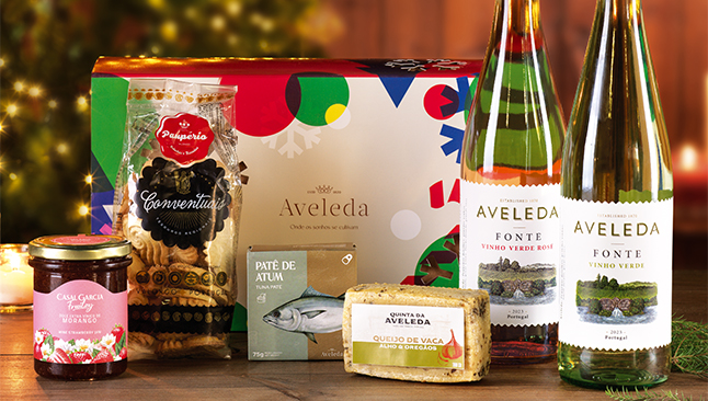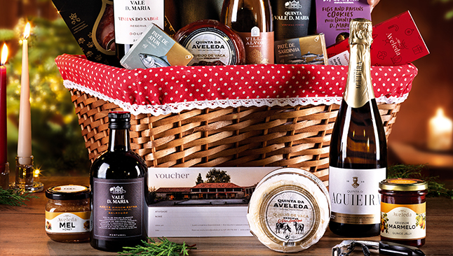 - Cabaz nº 22 (150€): uma cesta premium com vinhos Aveleda (Parcela do Convento e Parcela do Roseiral), espumante Aveleda e queijos curado e amanteigado. Há ainda marmelada, patês, bolachas Paupério, mel, azeite Vale D. Maria e conserva de sardinha. Inclui uma experiência de prova de castas para duas pessoas.