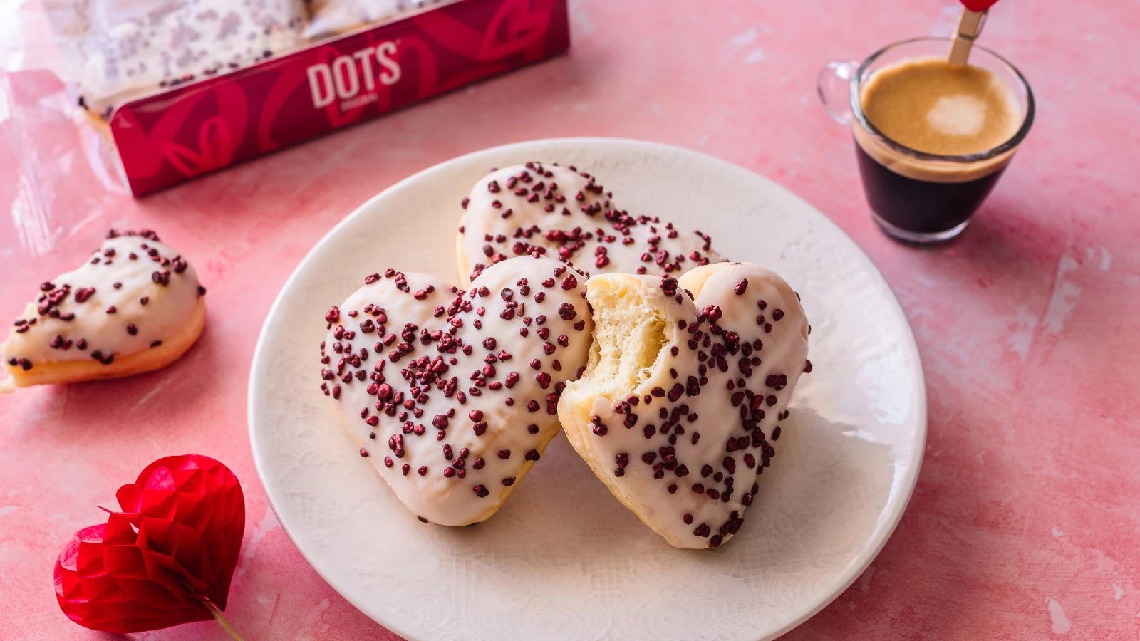 Em formato de coração, de massa açucarada com ligeiras notas de baunilha e decorado com fondant branco e pérolas coloridas, estes doughnuts são perfeitos para serem saboreados a dois.