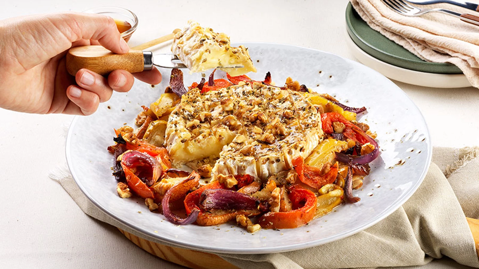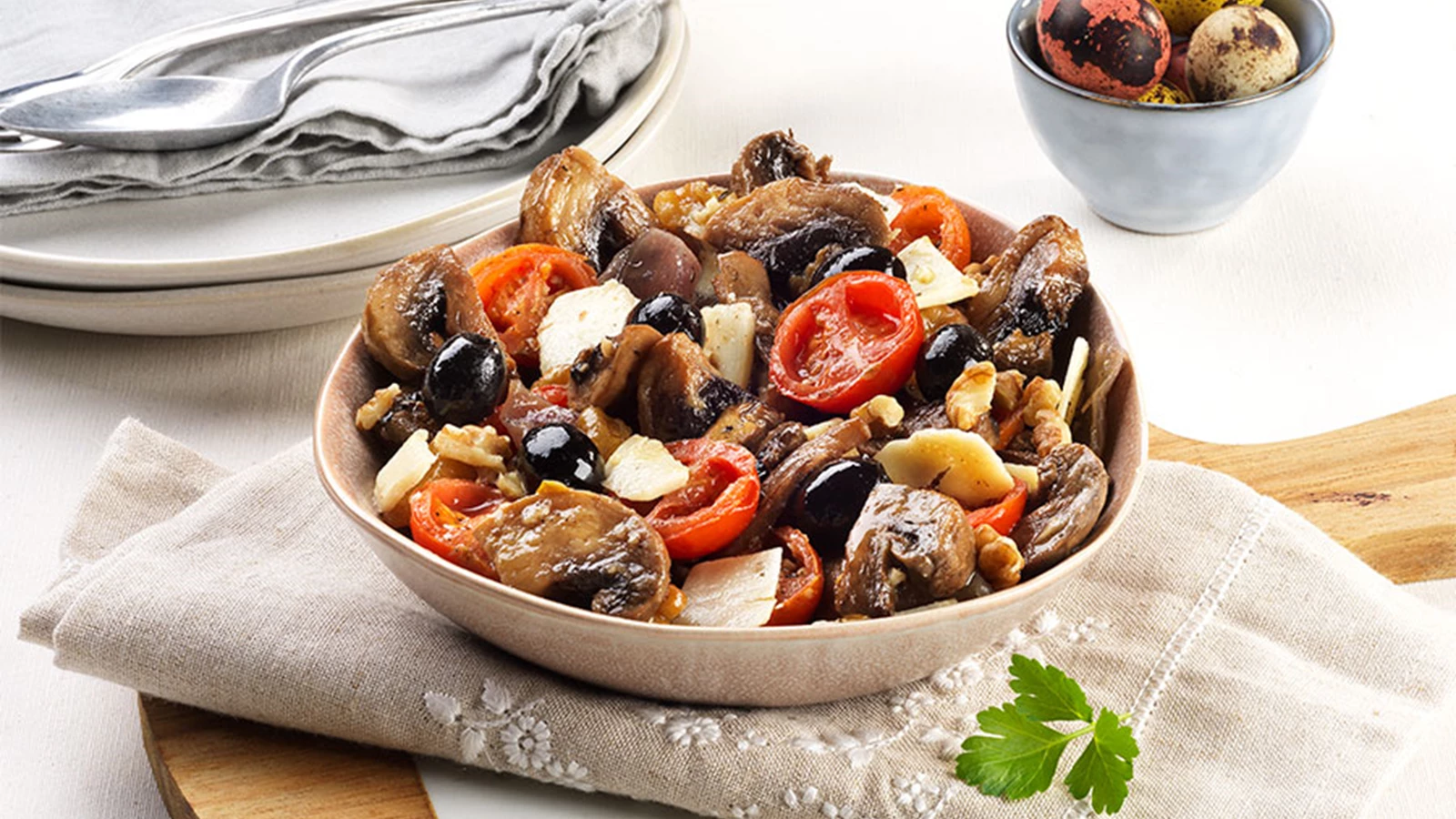 Experimente a Salada de Batata com Queijo Creme e Salmão Fumado, com sabores frescos, ou a Salada de Cogumelos com Nozes e Queijo Curado, que pode servida fria, como entrada, ou quente, como prato vegetariano. Se quiser surpreender, coza massa al dente, salteie na frigideira juntamente com a salada de cogumelos e sirva com folhas de manjericão fresco.