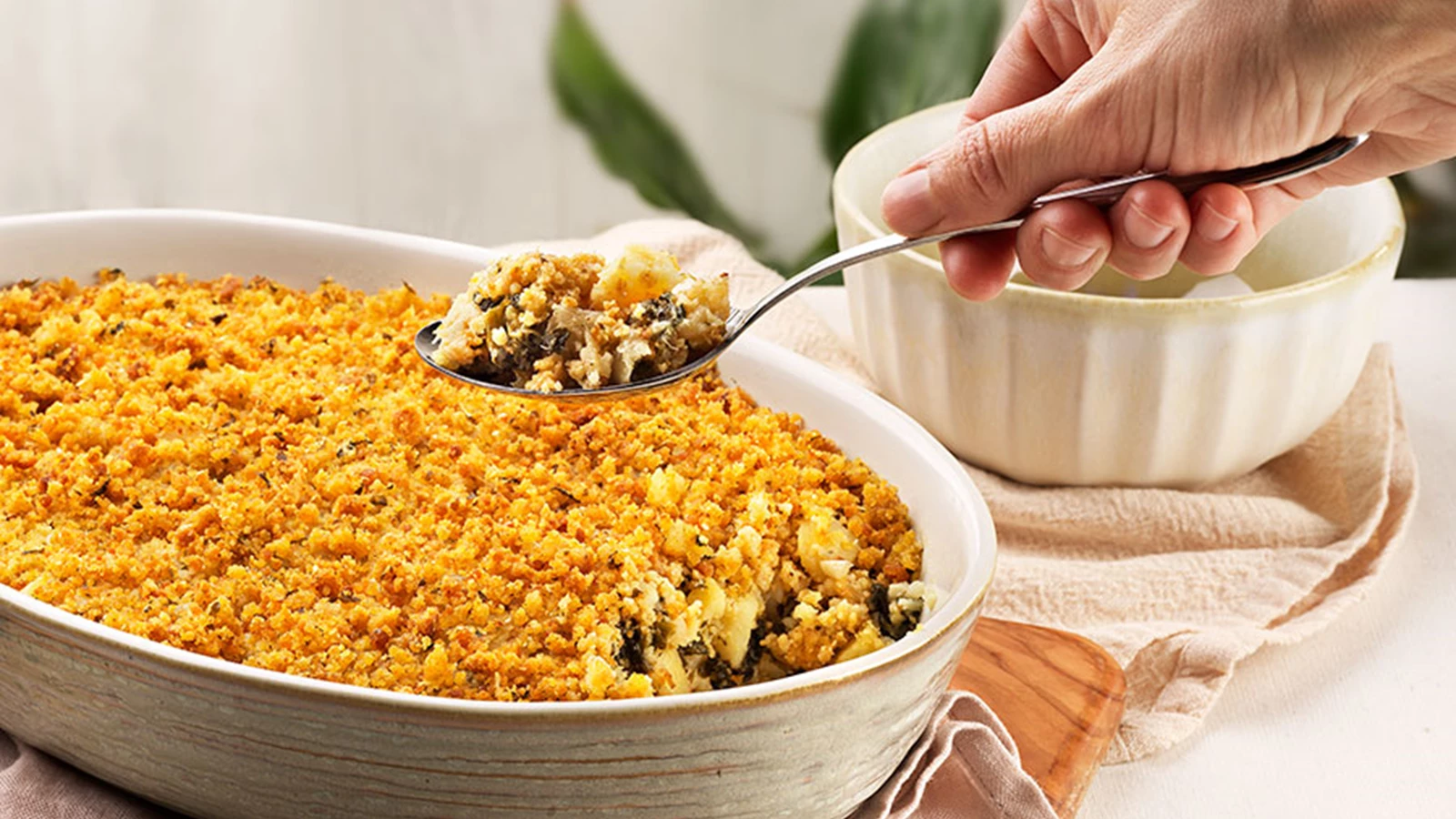 Das 1001 formas de combinar o bacalhau, esta receita presenteia-nos com a combinação perfeita das lascas de bacalhau com os espinafres e a crocância da broa. Coloque numa travessa e leve ao forno pré-aquecido a 180º entre 20 a 25 minutos para que a crosta de broa fique crocante.