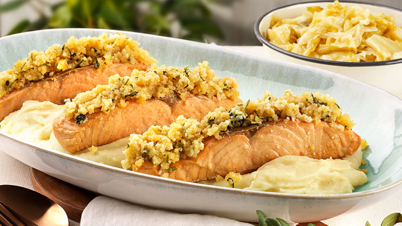 Lombos de Salmão com Crumble de Broa e Puré de Batata