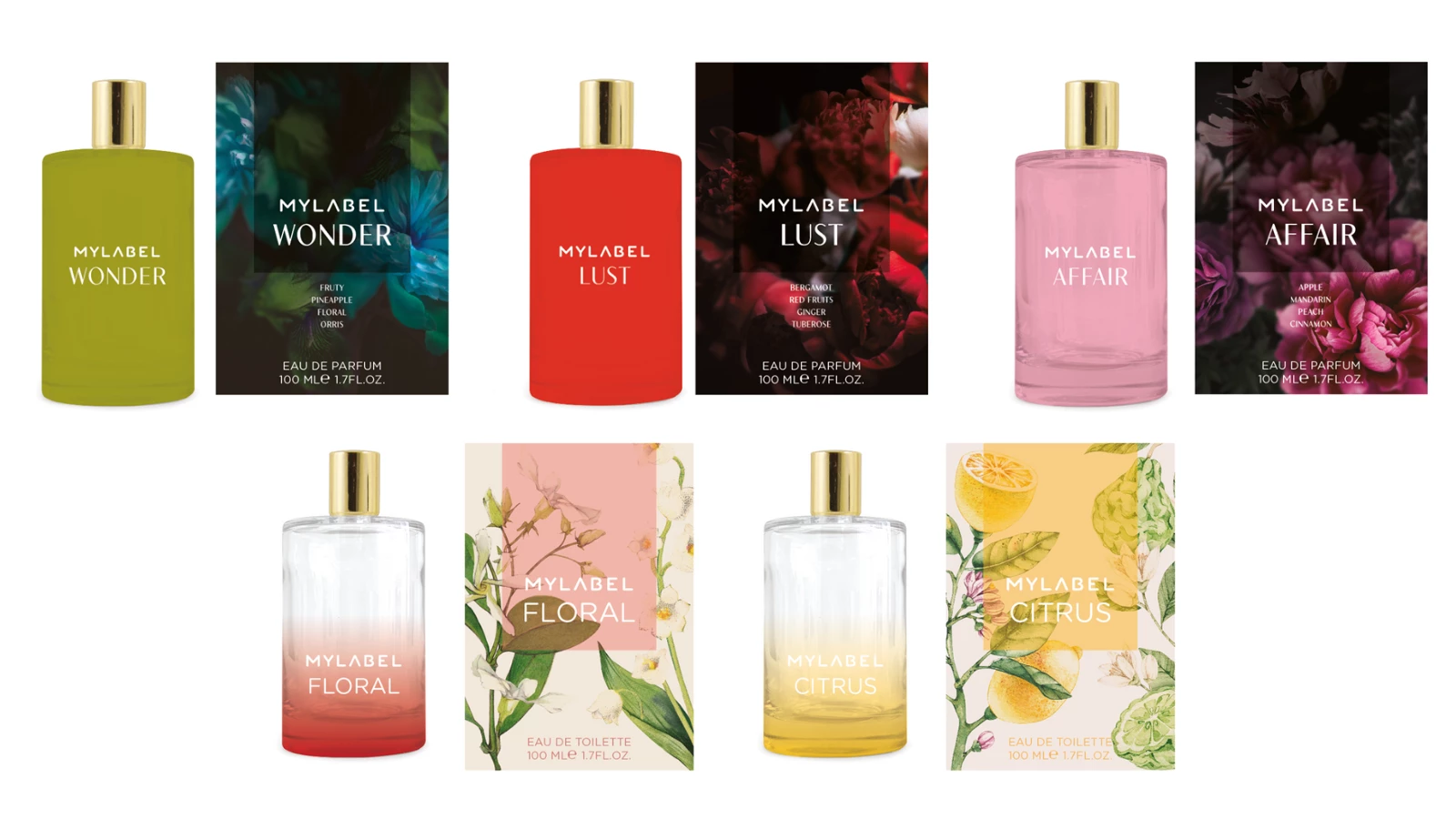 Da gama de perfumes e eau de toilette para senhora da marca MyLABEL, destacamos os seguintes: