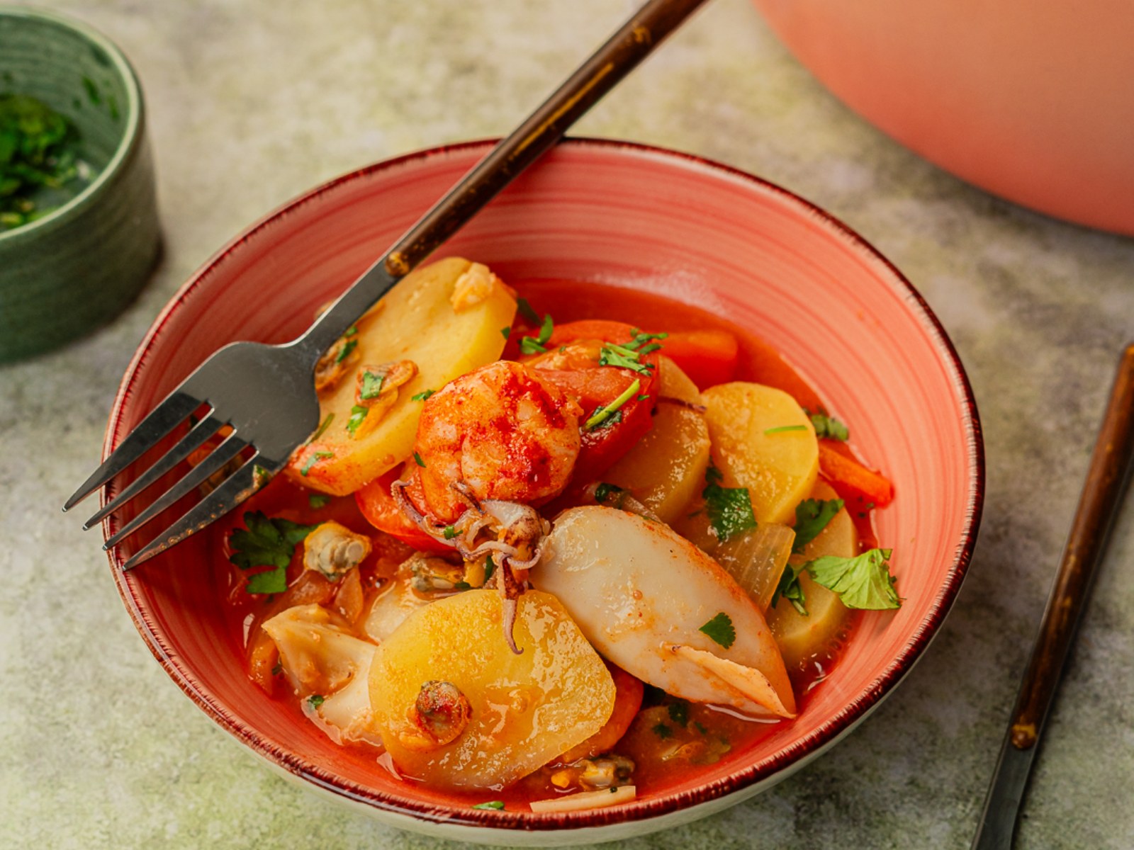 Junte o camarão e os coentros ao pão, e desligue o lume.