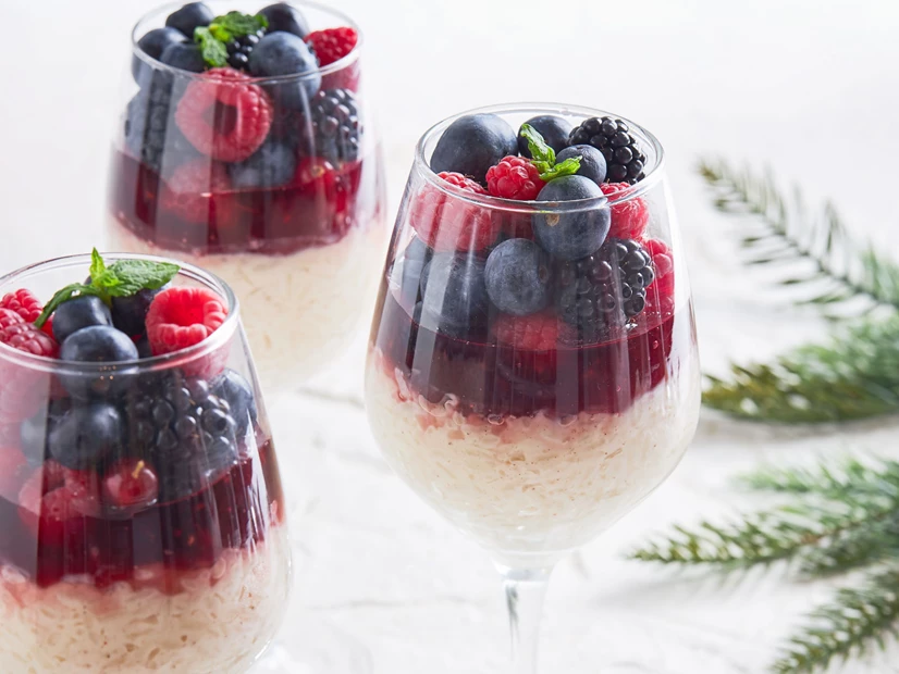 Uma deliciosa sobremesa, em que a doçura do arroz-doce é equilibrada pela acidez dos frutos vermelhos.