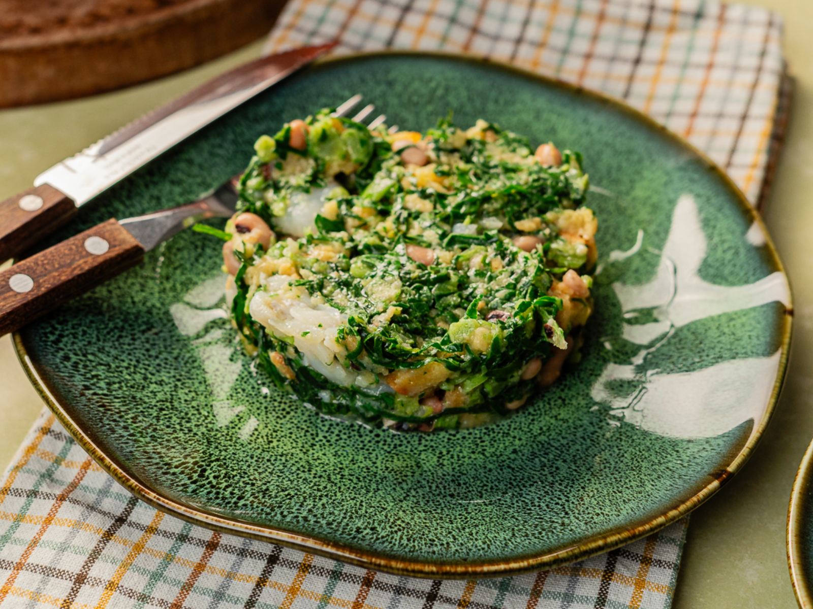 Retire o louro da frigideira, junte os ovos e misture bem (se estiver muito líquido, pode levar ao lume um pouco). Adicione a restante batata palha e envolva bem.