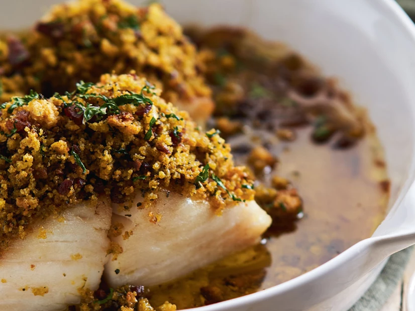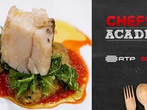 Bacalhau confitado com esmagada de grão-de-bico e couve