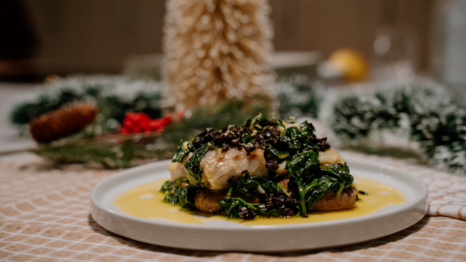 Saltear os espinafres rapidamente em azeite e alho e servir tudo junto.