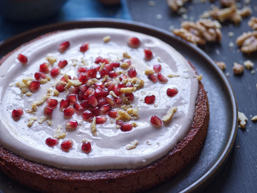 Cubra o bolo com o preparado e decore-o com fruta a gosto e nozes.