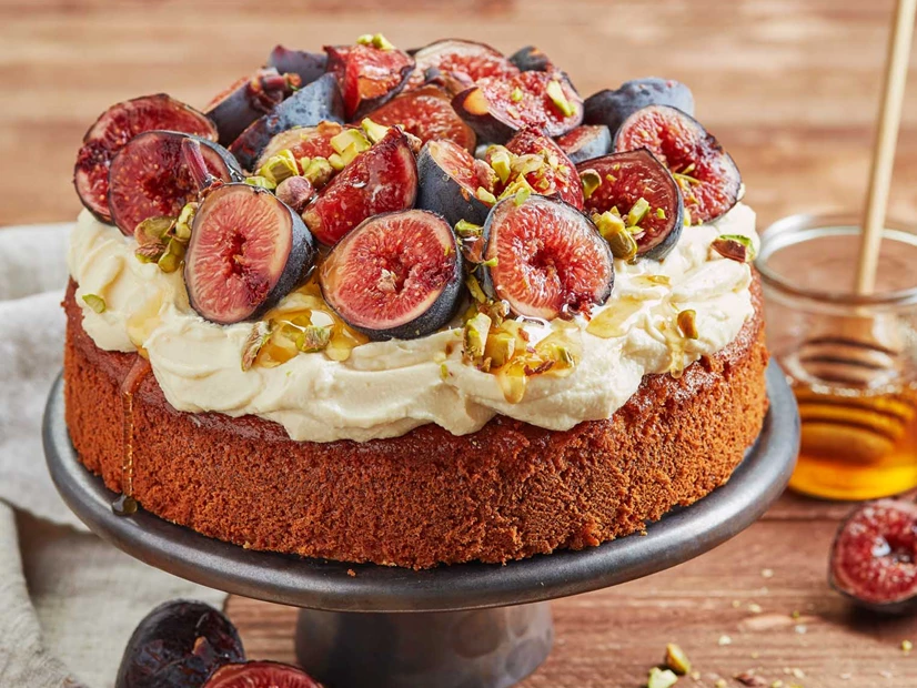 Barre o bolo arrefecido com esta mistura e decore-o com os figos cortados ao meio e os pistácios triturados.