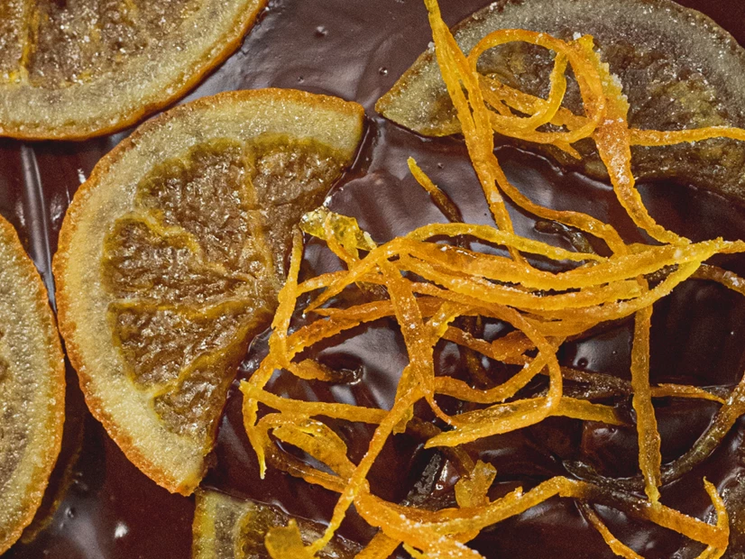 Finalize com uma cascata de ganache de chocolate, feita com 200g de chocolate fundido com 200g de natas frescas e algumas laranjas e cascas de laranjas previamente caramelizadas: cortadas finamente e levadas ao forno cobertas de açúcar e sumo de limão.