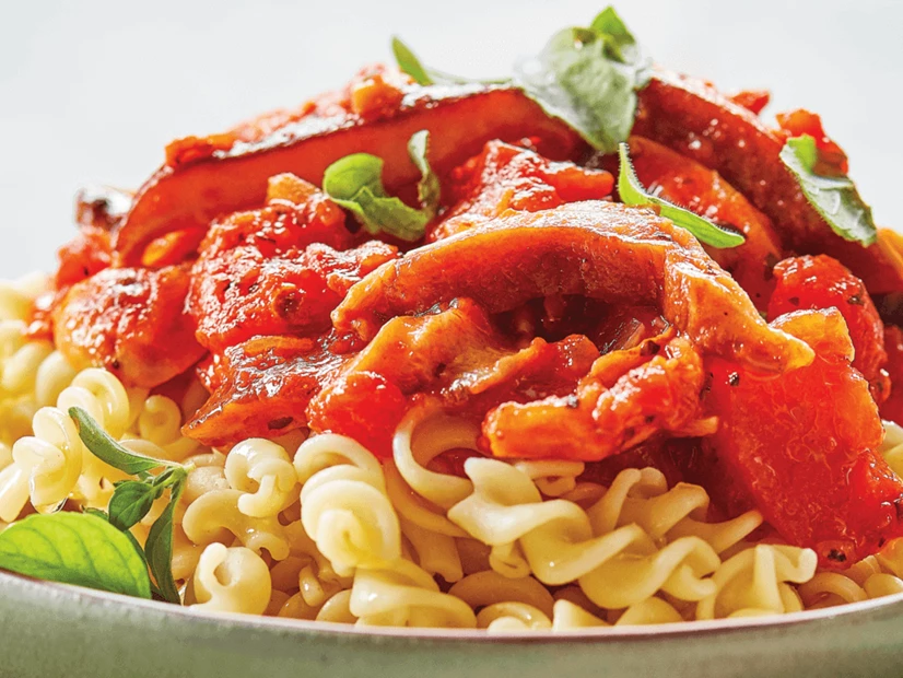 Sirva a bolonhesa com uma massa a gosto (espirais, por exemplo) e polvilhe com orégãos frescos.