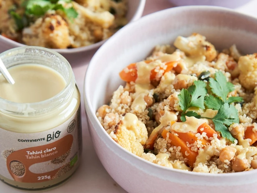Uma refeição saudável e deliciosa que combina legumes assados, quinoa e molho de tahini numa tigela.