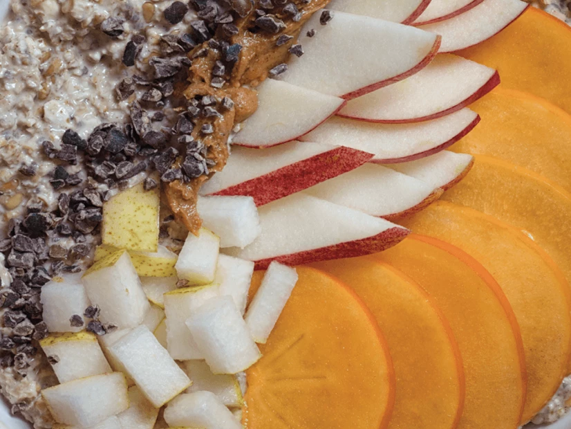 Disponha o preparado anterior em 4 bowls e cubra-o com a maçã cortada em fatias, a pera cortada em pedaços e o dióspiro cortado em meias-luas.