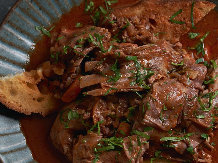 Ponha as fatias de pão nos pratos e disponha o guisado por cima, polvilhado com coentros laminados.