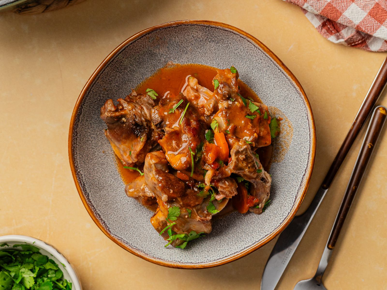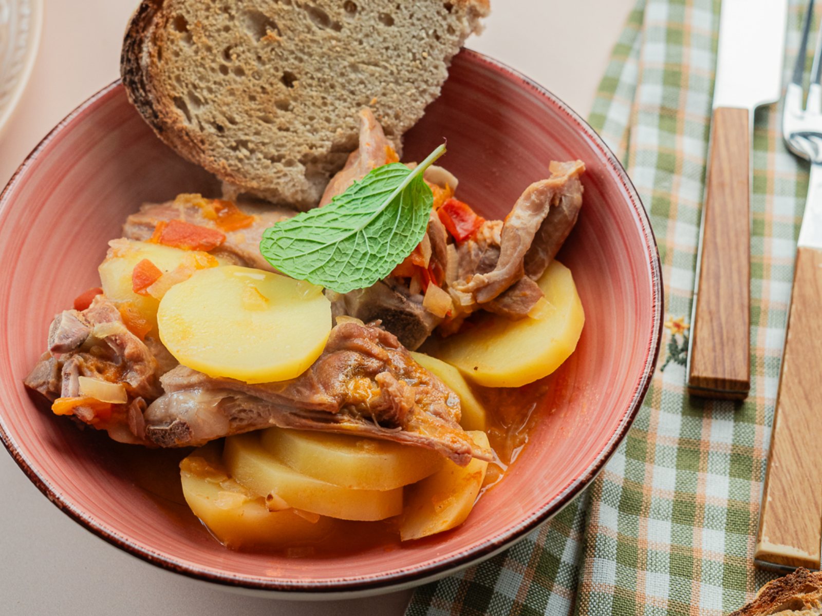 Adicione as batatas às rodelas e o pimento vermelho em tiras. Cozinhe em lume brando por mais 15 a 20 minutos, até a carne e os legumes ficarem macios.