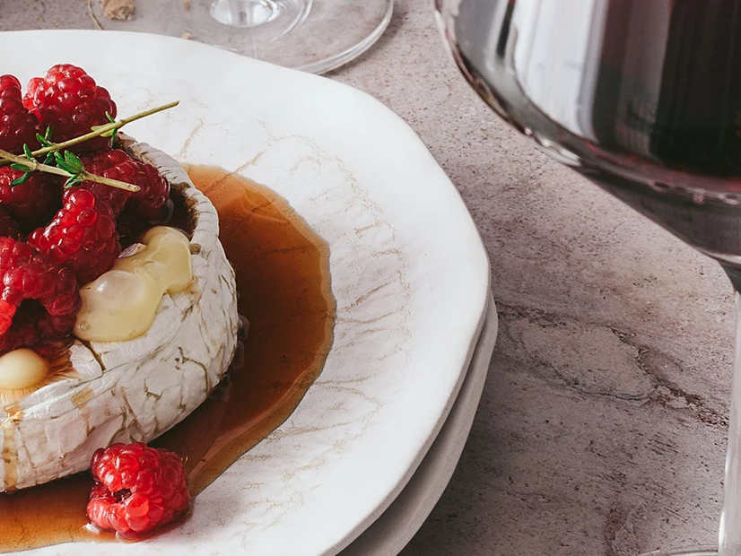 Adicione as framboesas por cima do camembert e regue com um pouco de mel aquecido. Coloque uns raminhos de tomilho para dar aroma. Sirva com vinho tinto num copo Schott Zwiesel.