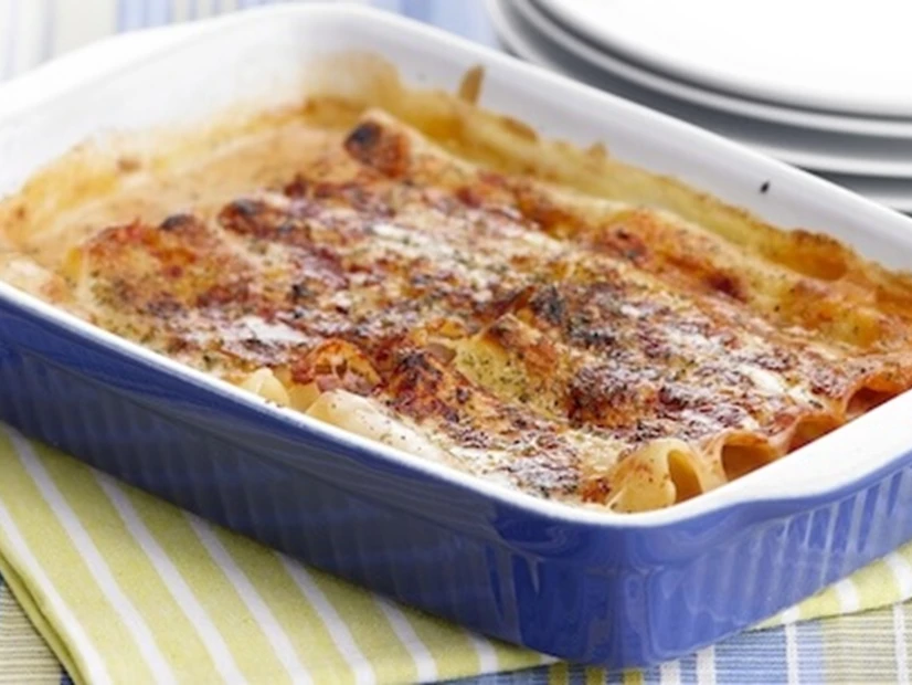 Numa taça misture o queijo e o fiambre. Recheie os cannelloni com a mistura de queijo e fiambre. Coloque-os no tabuleiro.
