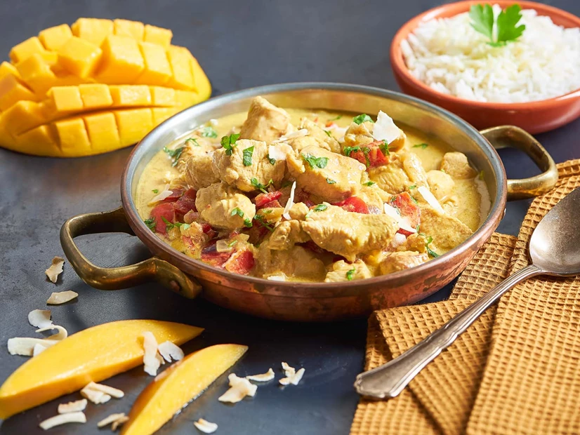 Caril de Frango, Coco e Manga, uma explosão de sabores tropicais.