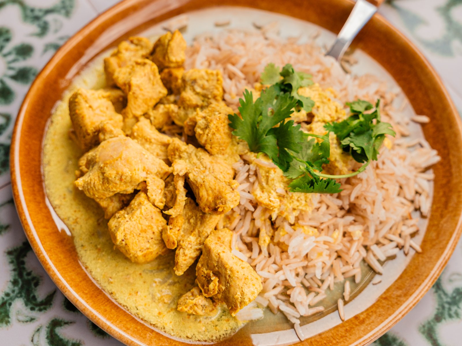 Sirva o caril de peru com o arroz basmati cozido. Decore com coentros.
