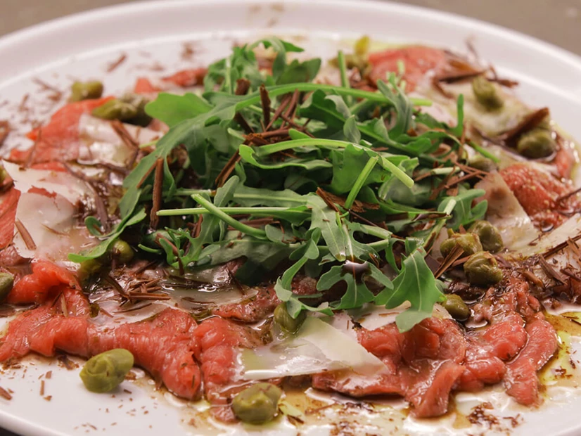 Coloque por cima as lascas de queijo, as alcaparras e a rúcula no centro da carne. Tempere com um fio de azeite e vinagre balsâmico a gosto.