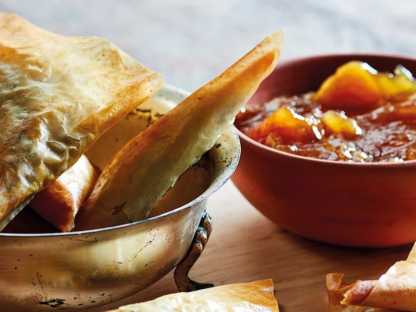Pincele as chamuças com a manteiga e leve ao forno até ficarem douradas. Sirva com o chutney de manga e gengibre e acompanhe com uma cerveja cobra bem fresca.