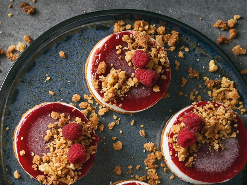 Sirva os cheesecakes polvilhados com o crumble e framboesas.