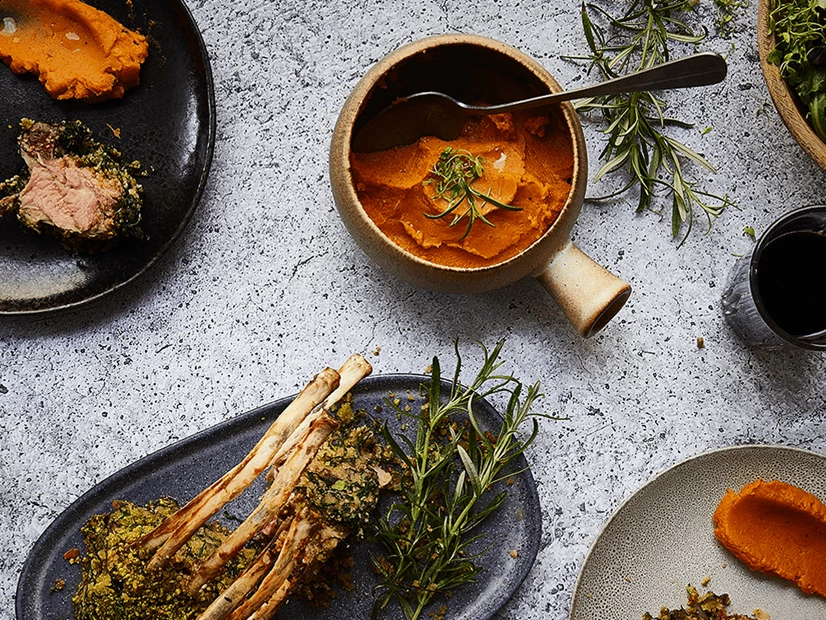 Escorra a batata doce, remova o ramo de alecrim, acrescente o azeite, tempere com sal e pimenta e reduza a um puré com a ajuda de uma varinha mágica. Sirva com as costeletas.