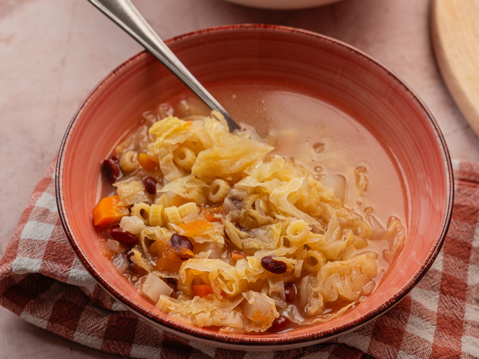 Numa frigideira refogue primeiro a cebola roxa num fio de azeite. Adicione a cenoura ralada e a couve lombarda e deixe saltear por alguns minutos.