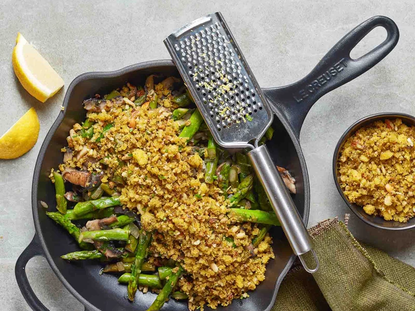 Sirva os espargos e os cogumelos com este crumble de broa por cima.