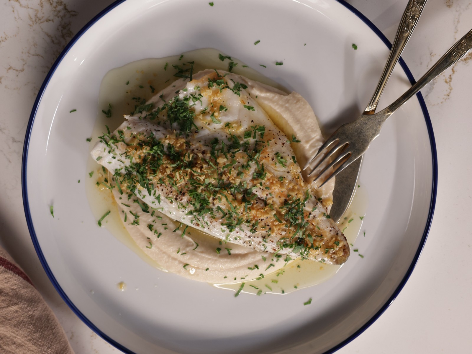 Sirva os filetes de dourada sobre o puré. Regue com o molho e guarneça com salsa picada.