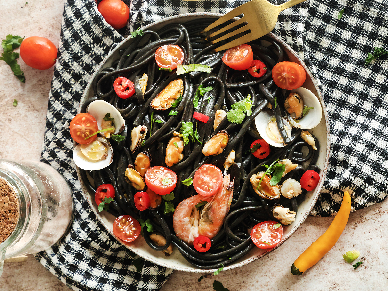Num tabuleiro de forma, coloque papel de prata. Coloque o alho francês cortado às rodelas, o tomate cereja em metades, as malaguetas sem sementes à rodelas.
