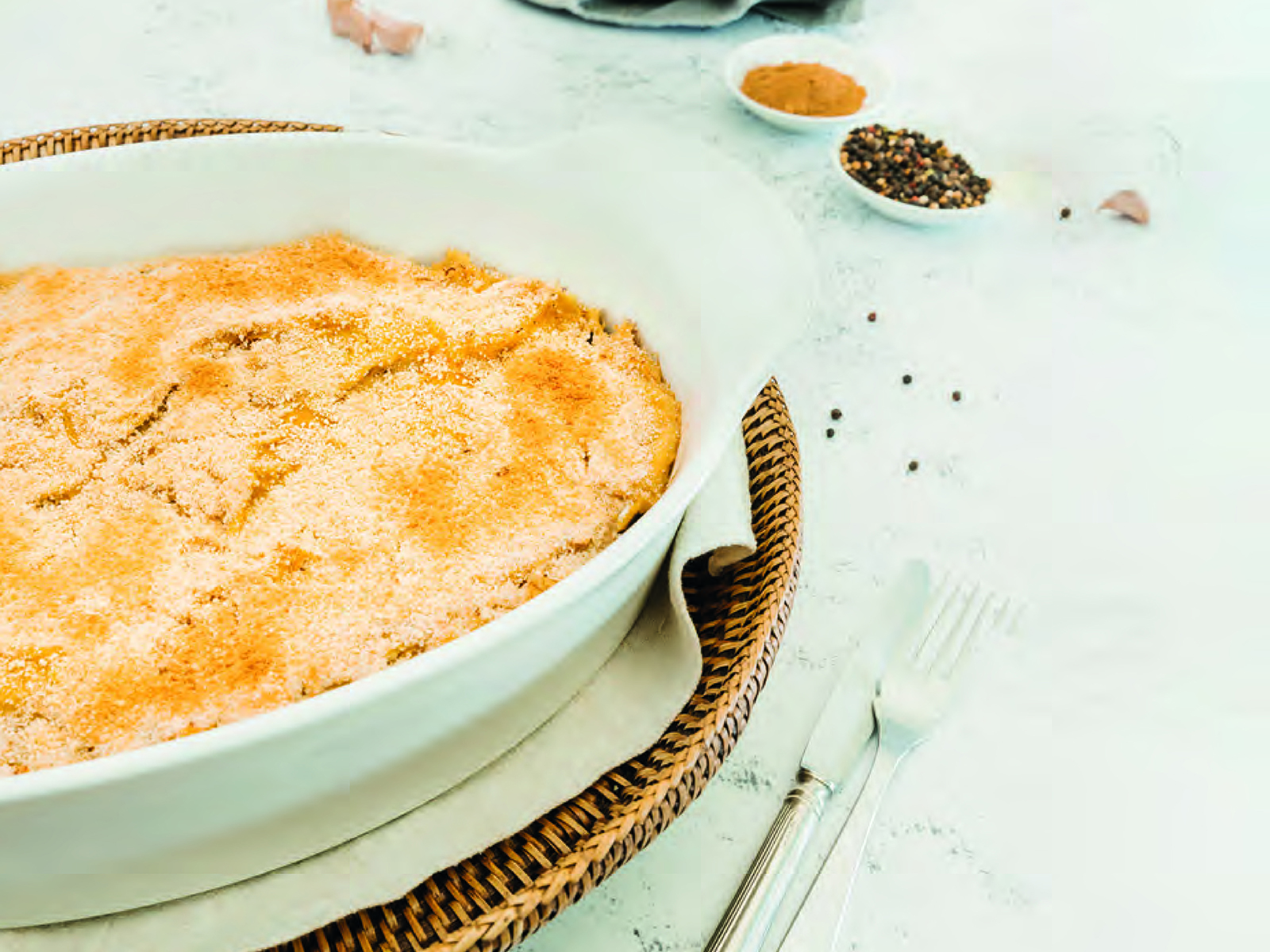 Espalha metade do puré numa travessa, distribua por cima o salmão em posta escorrido e cobre com o restante puré.
