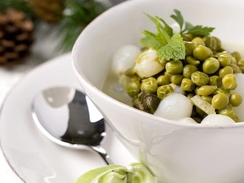 Descasque as ervilhas e as cebolinhas e corte a alface em tiras grossas. Coloque tudo num tacho previamente untado com 50 g de manteiga. Tempere com sal, pimenta e açúcar.