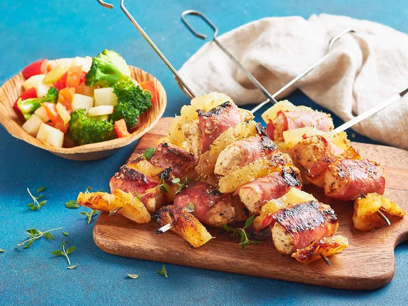 • Em paus de espetada, alterne cubos de peru e bacon com triângulos de ananás.